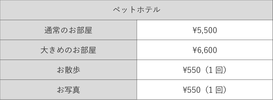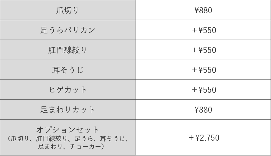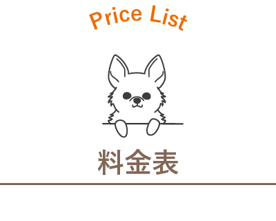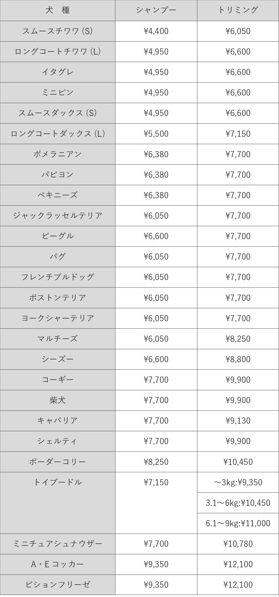 ※オールシザー料金・デザインカット料金は別途¥1,100が必要です。 ※全てのコースには【つめ切り、お耳掃除、肛門腺絞り、足うら、足まわりカット】が含まれています。 ※表示価格は全て税込です。 ※前日・当日のコース変更は原則お受けできません。 ※トリミング終了のご連絡後3時間以内でのお迎えをお願いします。 それ以降はお預かり料金が発生します。 最終の時間の子は19:45までにお迎えお願いします。
